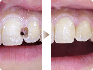 切削を最小限に抑え、保険治療の範囲内で白く修復することができる治療方法です。レジンを充填するリカバリー方法で、詰め物よりも健康な歯をより多く残すことが可能です。同様の手法で材料の制限がなく審美性を高めた自由診療をダイレクトボンディングと呼んでいます。